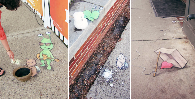 Meet Sluggo – a green semi-subterranean inhabitant of Ann Arbor, Michigan. This strange little creature first appeared back in 2008 on a sidewalk, and since then started peaking out of walls cracks, chilling on ledges or doing his daily routines all over the town. Turns out, it was drawn by a local graphic artist David Zinn, using simple colored chalks. Calling himself an “inveterate doodler and a shameless word nerd”, David uses art as a problem-solving tool, even if the problem is a sad-looking street crack.