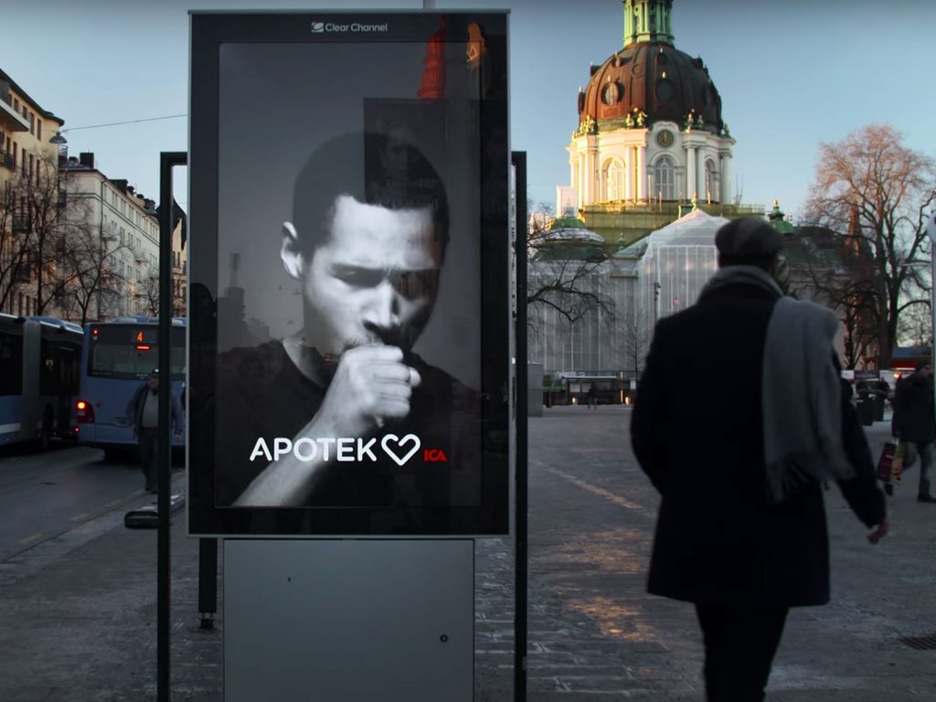 The ad for Swedish smoking aid firm Apotek Hjärtat uses embedded smoke detectors that trigger a video of a young actor coughing aggressively when a smoker passes by.