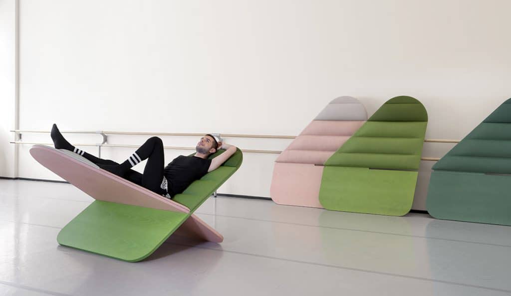 The Daydream by Joynout is designed for mental and physical relaxation. The design consists of wooden boards upholstered with Kvadrat fabrics.