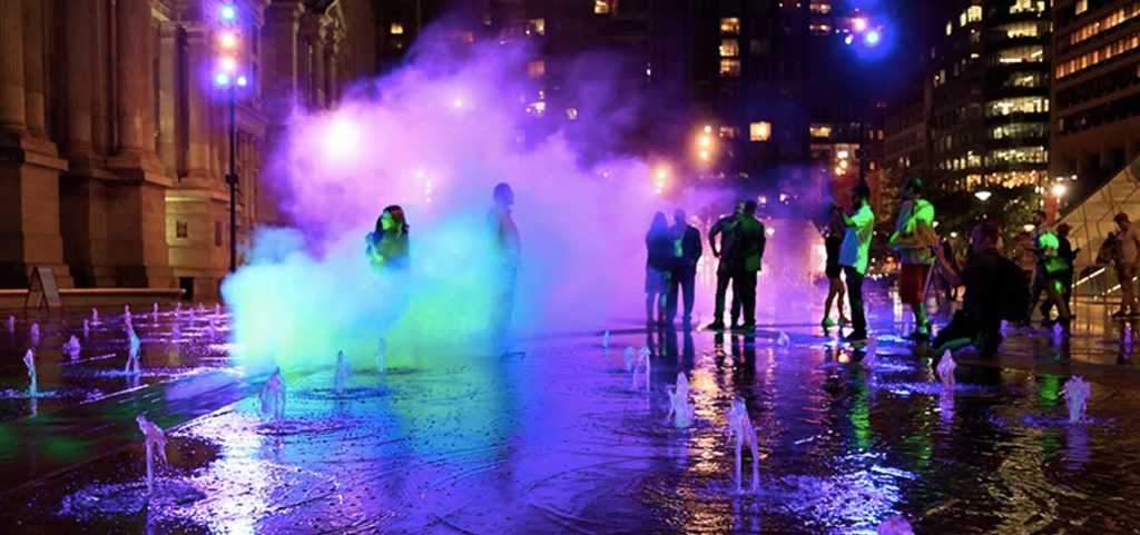 I’m thrilled to see pulse come to life – my first permanent artwork using cool mist with colored light. When I started work eight years ago, this was a forlorn plaza. so it’s especially exciting to see the colors come alive in this beautiful park. the art traces layers of Philadelphia’s history of water with water. with the successful opening of this first phase, I feel great momentum towards completion of the blue and orange lines to activate the entire park.’