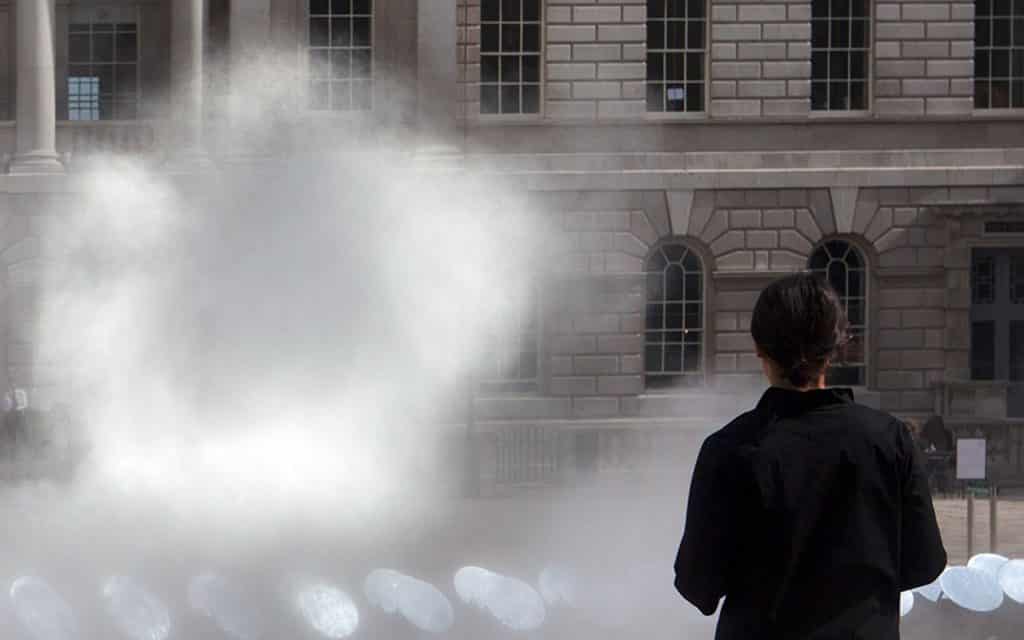Seoul Studio Kimchi and Chips sculpt with light to create Halo. The installation forms a circle of light suspended in the air above the Edmond J Safra Courtyard at Somerset House, created by an array of 99 robotic mirrors which track the sun. Each mirror draws a beam of sunlight into the mist of water. Together the straight beams are shaped together to draw a circle.