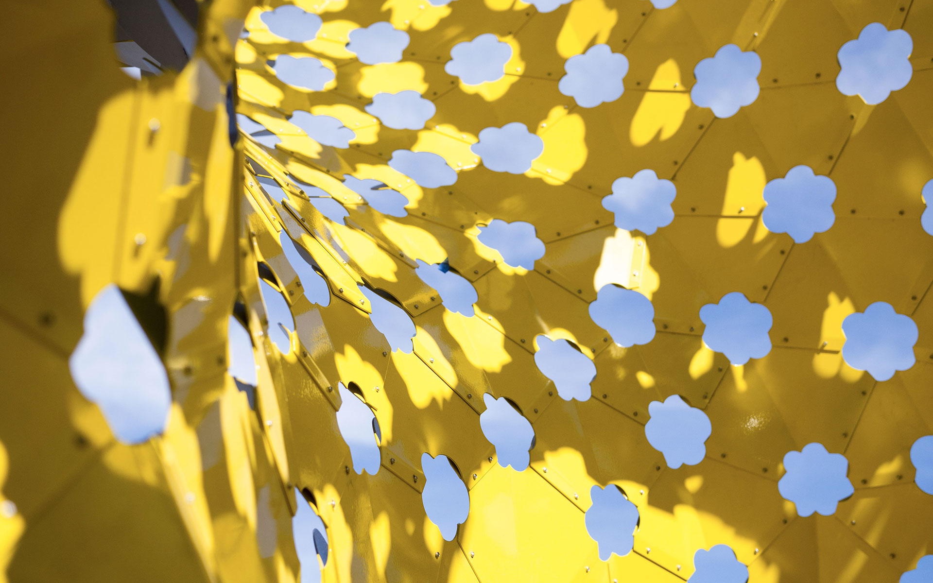 Seeds, spores, eggs and pollen exhibit fascinating tectonic and textural qualities which are unique to the species, yet ambiguous when compared to one another. As a result, the sculpture may be understood both as a large form when seen from a distance, as well as an assembly of many small parts working together when viewed up close. The sculpture is created entirely from bead blasted stainless steel, with a yellow powder-coated interior surface.