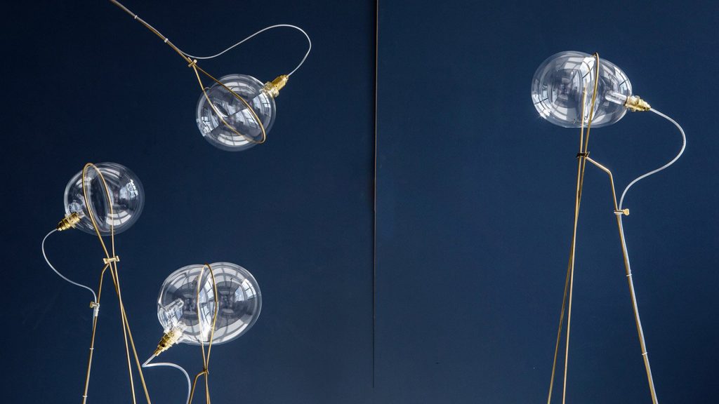 The Stress collection – named to reflect the tension between the two materials – is available as floor lamp versions, pendants, and wall lights held on curved brass wire.