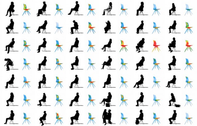 Hundreds of industrial sensors integrated into the prototype capture every movement and simultaneously display it as a realtime false colour force simulation, thus exposing and visualizing the flow of forces normally hidden from the human eye. The data is processed by custom algorithms to adjust the final geometry and construction of the end product accordingly.