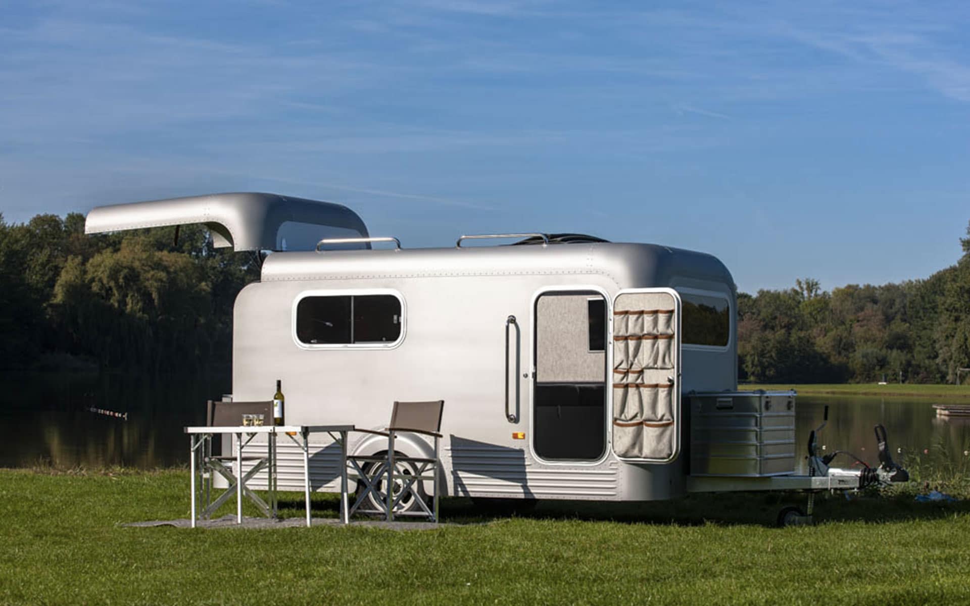 Strong and lightweight thanks to its aluminum sandwich construction, the trailer packs a double bed and kitchen, while its interior can be customized to fit any demands.