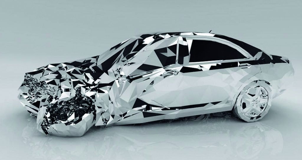 This is Wreck, a non-functional model of a Mercedes Benz S550 made entirely from reflective stainless steel created by Jordan Griska in 2016.